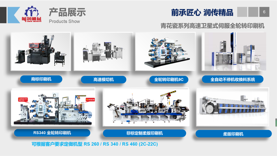 主營設備商標印刷機衛(wèi)星式輪轉印刷機模切機 等產品,公司可為客戶量身制定商標機、輪轉機等自動化解決方案。公司有強大的研發(fā)體系,確保能為客戶量身定制各類非標且最有價值的產品;前潤機械在國內外擁有極高的市場占有率及良好的信譽,贏得了眾多知名企業(yè)的青睞與合作,產品暢銷多個國家和地區(qū),市場銷量近萬臺;我們愿與您攜手合作,建立長久雙贏機制,共享成功喜悅!加盟熱線:133 2260 8282