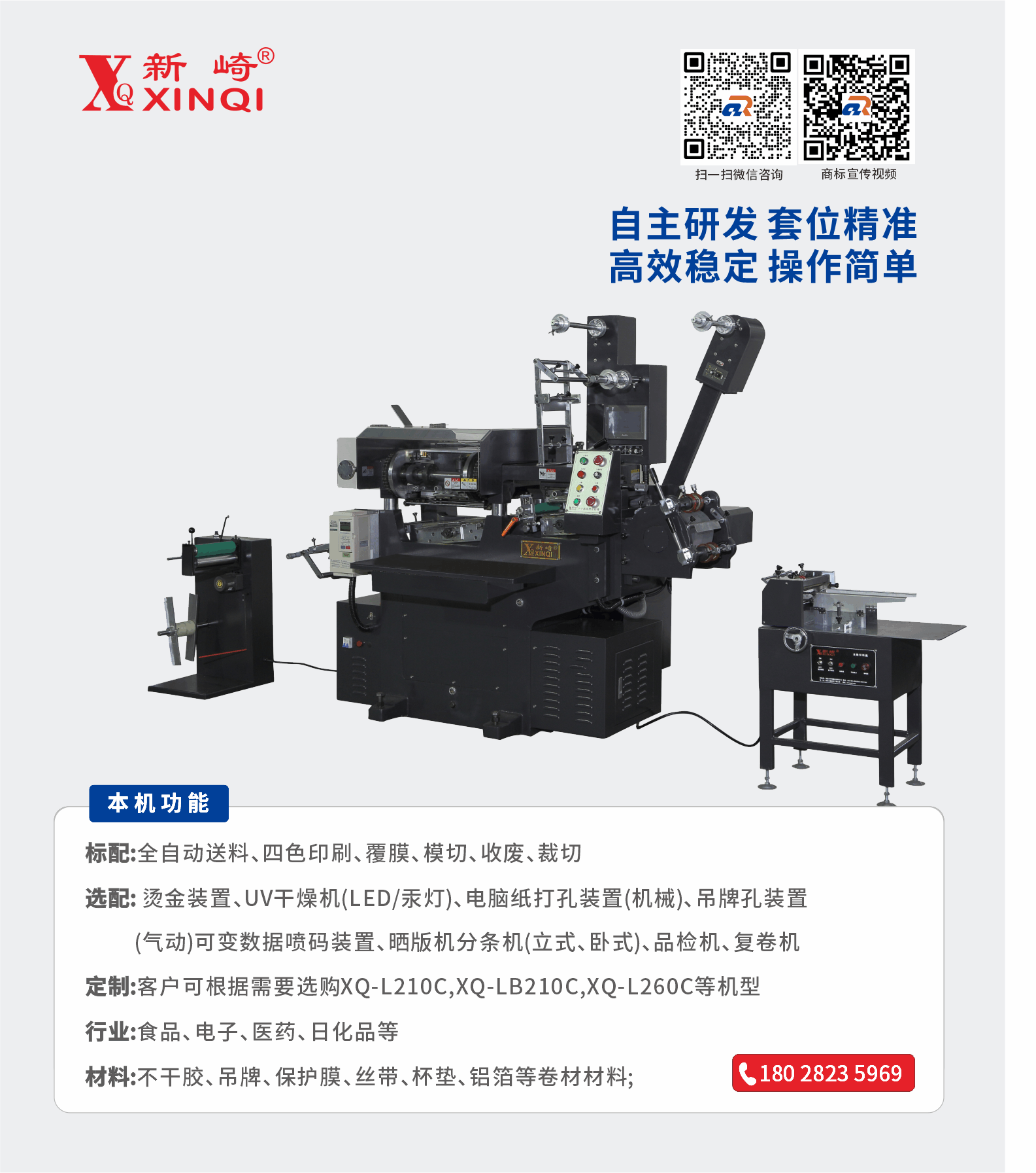 新崎XQ-L210C商標印刷機操作簡便高速靈活套位精確自動送紙印刷采用斜背式設計、印刷和模切在機械動作以漸進的方式接觸,使壓力得以平均、無論印大面積底色或者細小字時都可以清晰無