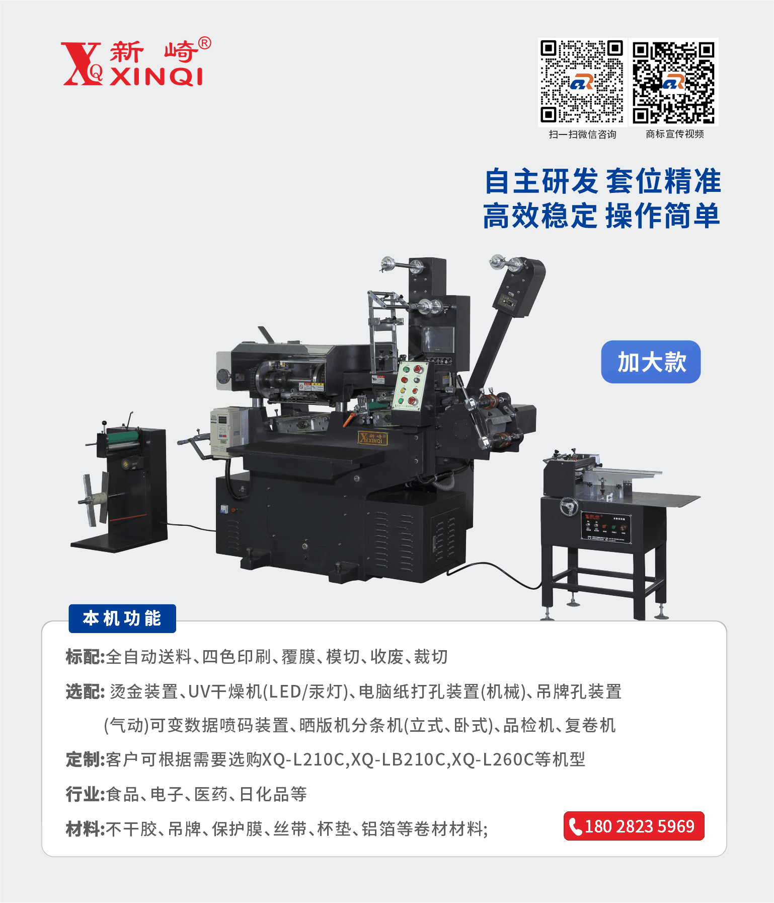 | 自動送紙、印刷、覆膜、模切、收廢、裁切。 |