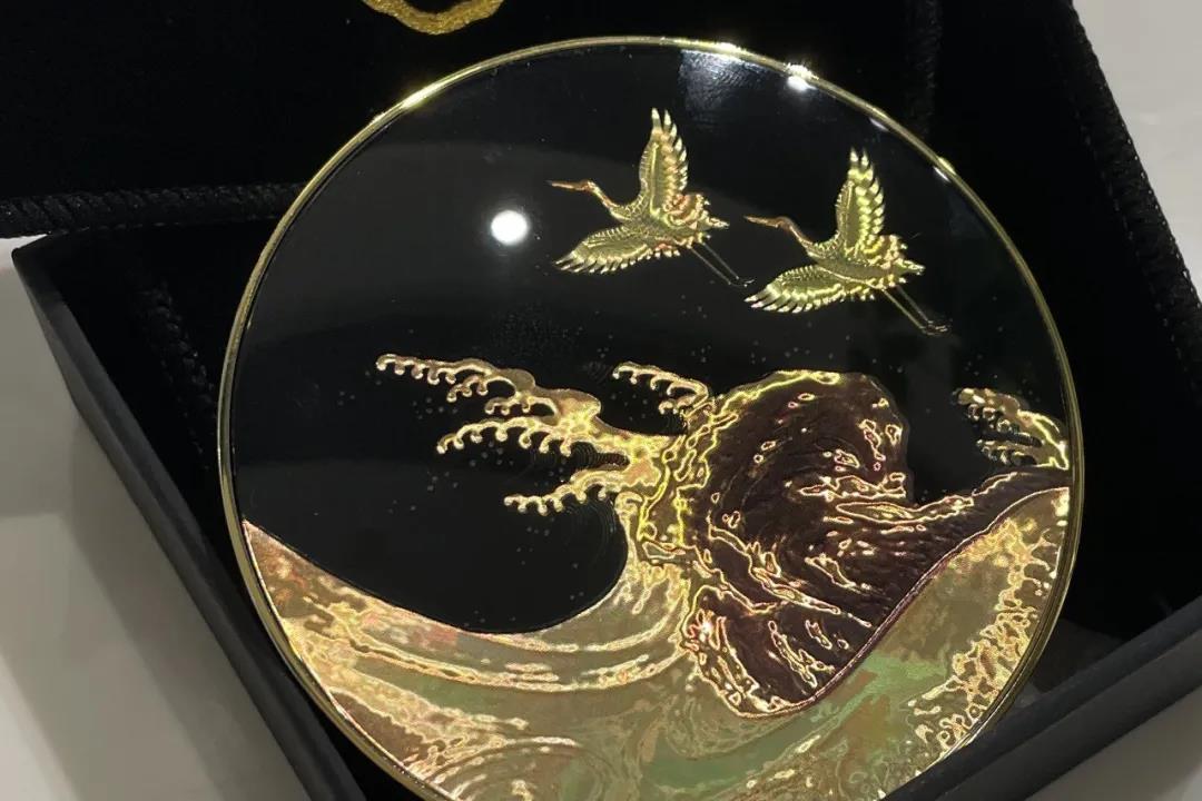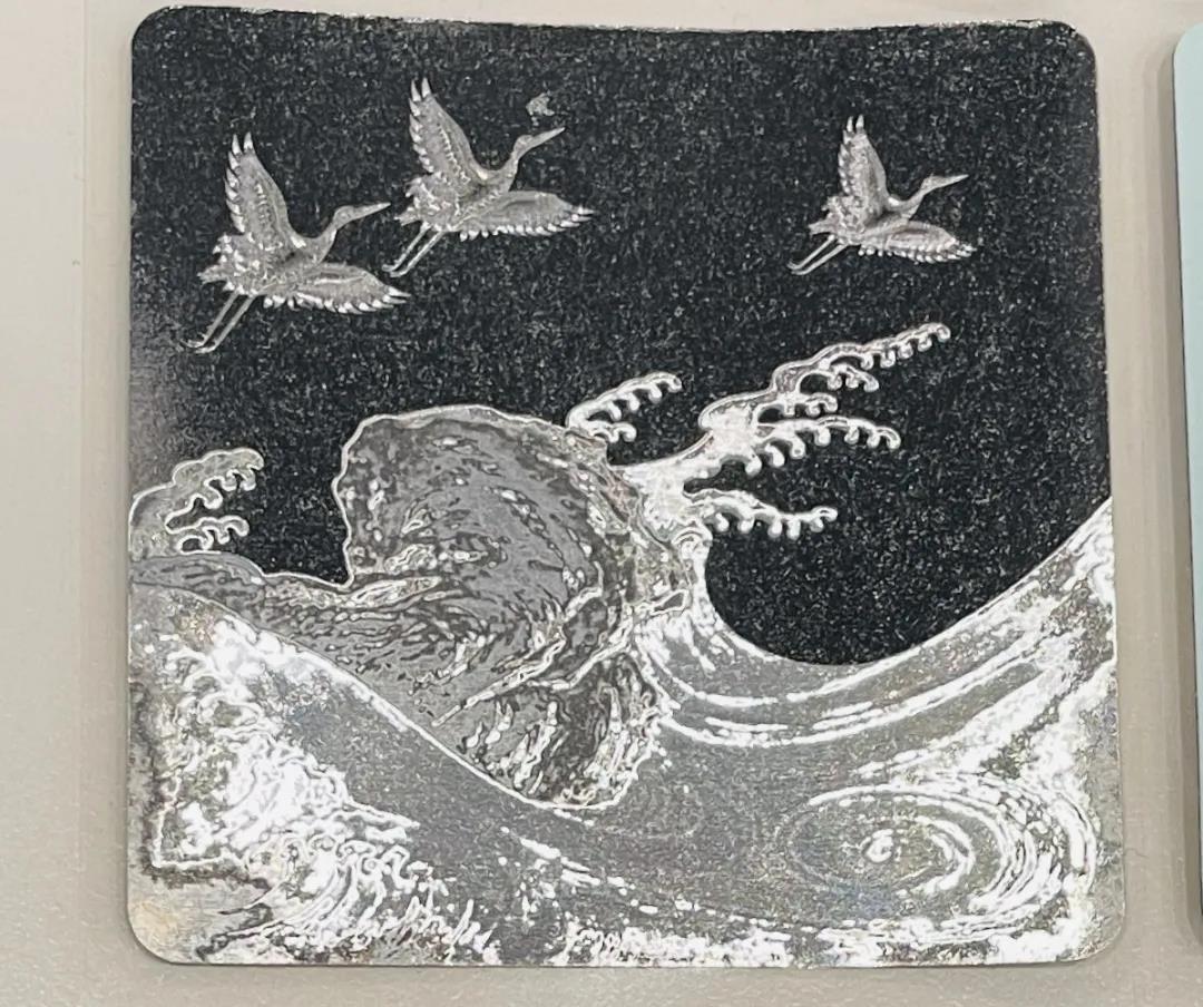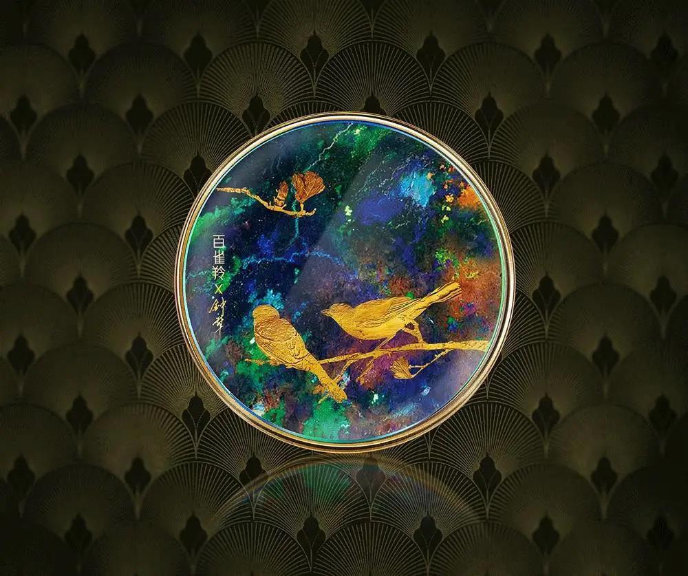 故宮合作的這款標簽,使用了定制圖案棱鏡效果的不干膠貓眼原材料,再進行定位4色印刷,還原了設計圖案中仙鶴和海浪的層層細節(jié)。