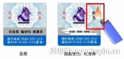 防偽油墨是標簽防偽技術體系中的一個重要部分,防偽油墨是指具有防偽功能的油墨,同樣由色料、連結料和油墨助劑組成,但在油墨連結料中加入了特殊性能的防偽材料并經特殊工藝加工而成,是特種印刷油墨。市面上主流的防偽油墨一般有紫外熒光油墨、日光變色油墨、熱敏油墨、化學反應變色油墨、水敏防偽油墨等等。用紫外熒光油墨印刷的產品,在專用的防偽熒光燈照射下,采用防偽熒光油墨印刷的標記會發亮,呈現出鮮艷的紅、橘紅、黃綠或綠色熒光,其熒光強度高,印刷適應性好,光亮消失也很快,在紫光燈關閉后,光亮即刻消失。日光變色油墨在日光的照射下會有字碼出現。熱敏油墨在加熱后變色,冷卻后圖形又復原(如圖1所示),屬于可逆變色油墨。